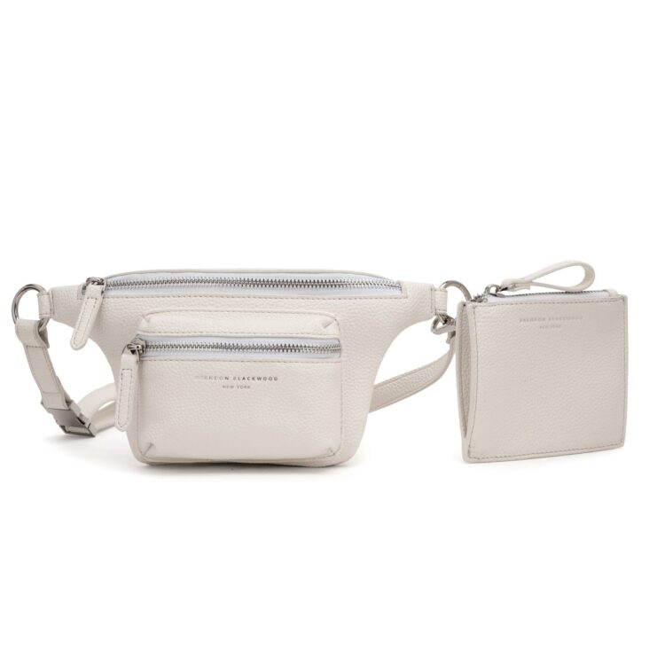 This bag is made from vegan leather with nylon tonal stitching and shiny silver hardware. “BRANDON BLACKWOOD NEW YORK” is embossed in silver on both the belt bag and the detachable change purse. The bag is 10″ wide, 5″ tall, and 3″ deep.