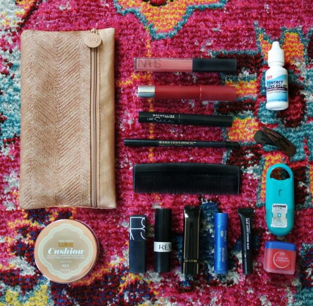 The shiny pouch (via my friend's Ipsy subscription) is my cosmetics bag.  As you can see, I have a bit of a lipcolor issue.  Let's see, there's NARS Viva gloss, Revlon Romantic balm stain, NARS Pigalle, Revlon Really Red, and Lancome Le Carmin.  Hey, I like to be prepared and able to switch up my look!  I also carry a travel-sized mascara, liquid and pencil liner for touch-ups and to amp up my look if I'm heading out after a day at the office.