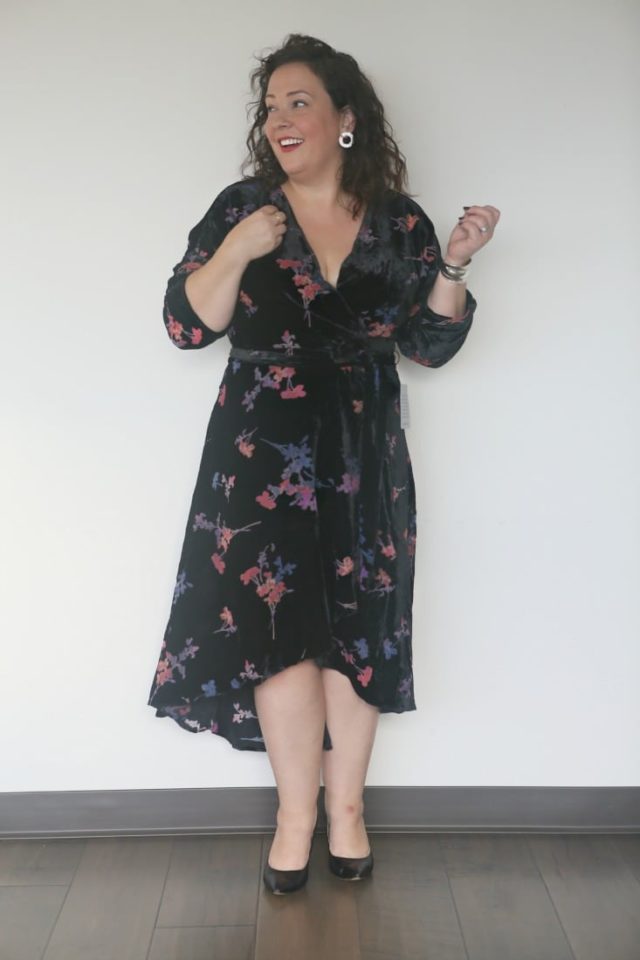 I was considering ordering this dress myself, but wasn't sure which pattern to choose (it comes in four prints and two solids). I likely wouldn't have chosen this print… but I like it! I think it would look good with black tall boots, or black tights and booties. I also think this print would look great with a denim jacket or a leather biker jacket. This is a really nice dress. It's the kind you can wear to work, but also wear for a night out. I don't have the neckline pinned, I likely would just to keep it a comfortable depth. I also think I would prefer this dress in petite as the sleeves are a bit too long. This dress isn't super stretchy like many wrap dresses; it has stretch but the fabric looks a bit more expensive and has a nice drape. I really like the cuff detail. I think I may exchange this dress for a petite. This dress retails for $99, comes in regular and petite sizes up to XXL.