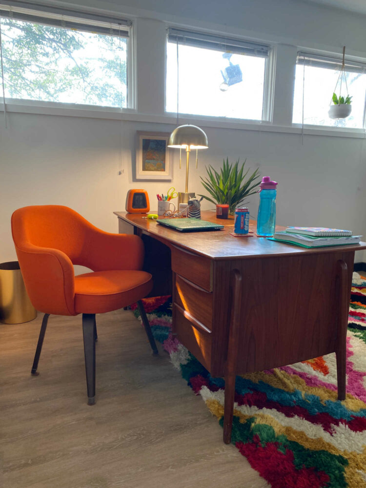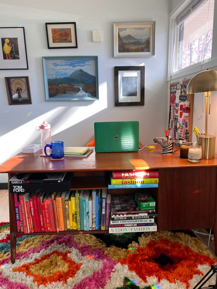 For a desk, I really wanted wood, and I really wanted a Mid-Century Modern piece. In 2021, everyone from Wayfair to World Market had MCM-inspired desks, but they all looked small and chintzy. I wanted something more substantial and began visiting local thrift and vintage shops, not concerned if the desk had some scuffs and damage as long as it functioned and fit the vibe. In fact, a bit of wear would nicely balance the crisp, colorful rug and furniture.