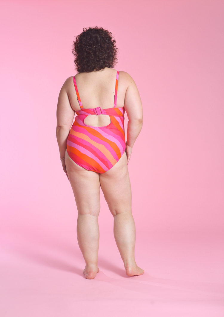 I love the print even more in person.  It's so darn happy and such a departure from most swimsuits that have tropical, watercolor, or animal print patterns.  However, an F cup was too big and like the orange and pink suit above, I was desiring more control or another layer of fabric in the torso to complement the structure of the bodice.  I did not take pictures of it without the strap because I knew the cups were too big and I would spill out.