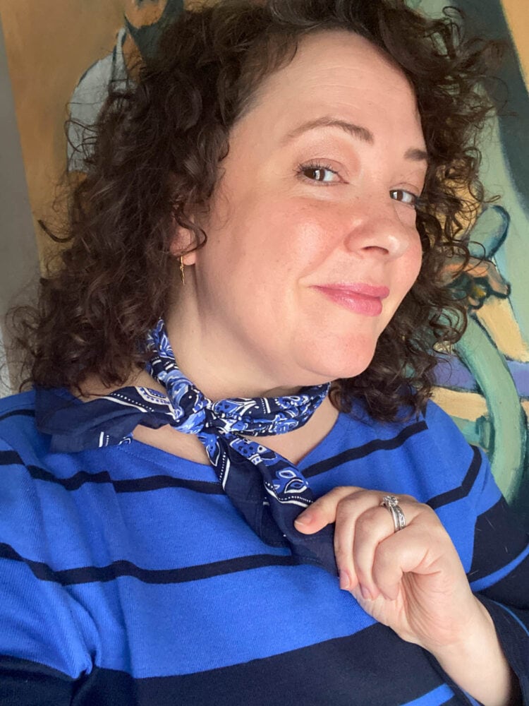 The bandana is also from Talbots; it's cotton and a bit bigger than a traditional bandana at 24″ square. I like this because I often find bandanas too short for comfort when worn at the neck but like the cotton which doesn't slip and slide and looks more at home with knit tops and weekend looks.