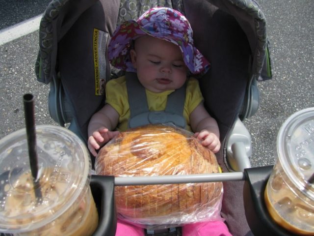 Emerson had a great time bonding with all the other babies at the market, here she is checking out the jalapeno cheese bread we picked up.