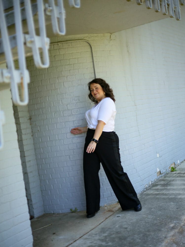 So, Universal Standard “picked” for me the Stephanie pants with the black stripe, the Lily Liquid Jersey v-neck in white, and the Peyton Poplin shirtdress in black. I received all three pieces in XS, which is my standard US size. In other brands, I am usually a size 14 and at 5'3″ often choose petite, especially for dresses, pants, and blazers.