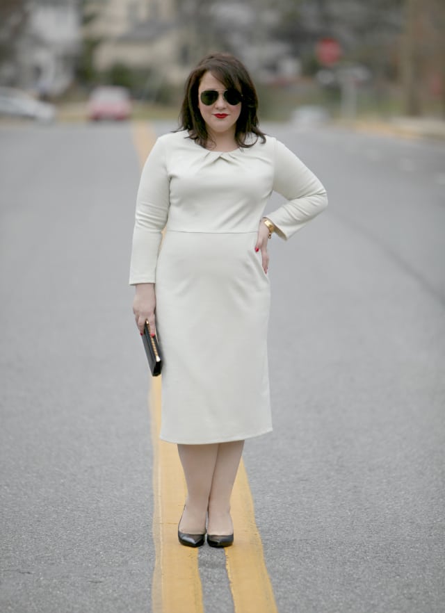 This off-white ponte dress is from the latest collection from emploi New York. In a surprisingly flattering color on my winter fair skin and a ponte fabric that is comfortable and warmer than many knits, this is a great “desk to drinks” dress that could easily dress up for the holiday season.