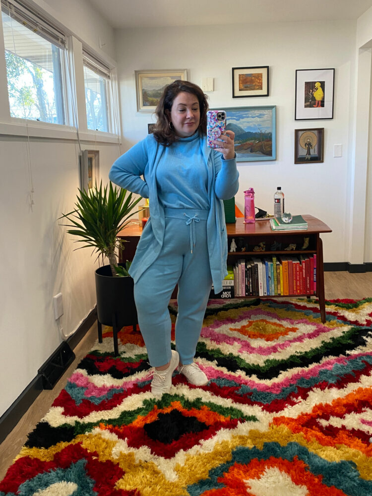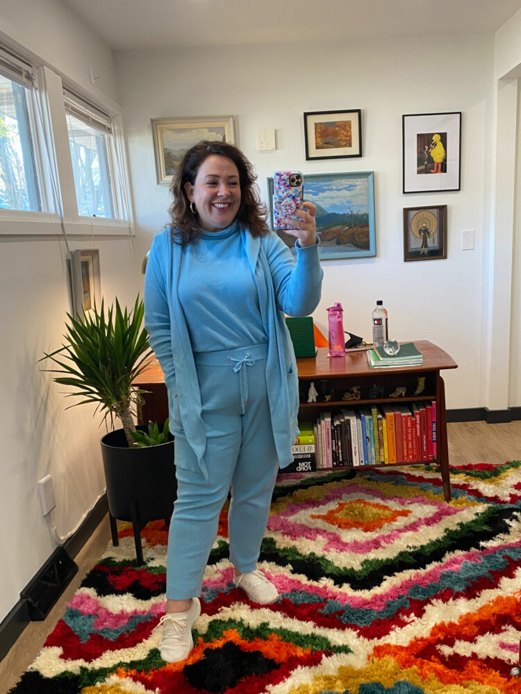 When you have your own office you can wear what you want, but I like to dress up a bit. It's one of the perks of having a place outside the home to go to, but I still want to be comfy. I decided this day to pair a blazer with joggers. I've done it before (oh look at that innocent person having no idea what was around the corner in a few weeks' time), but this time it's blue on blue.
