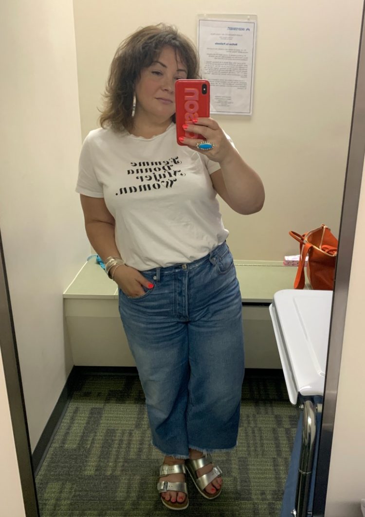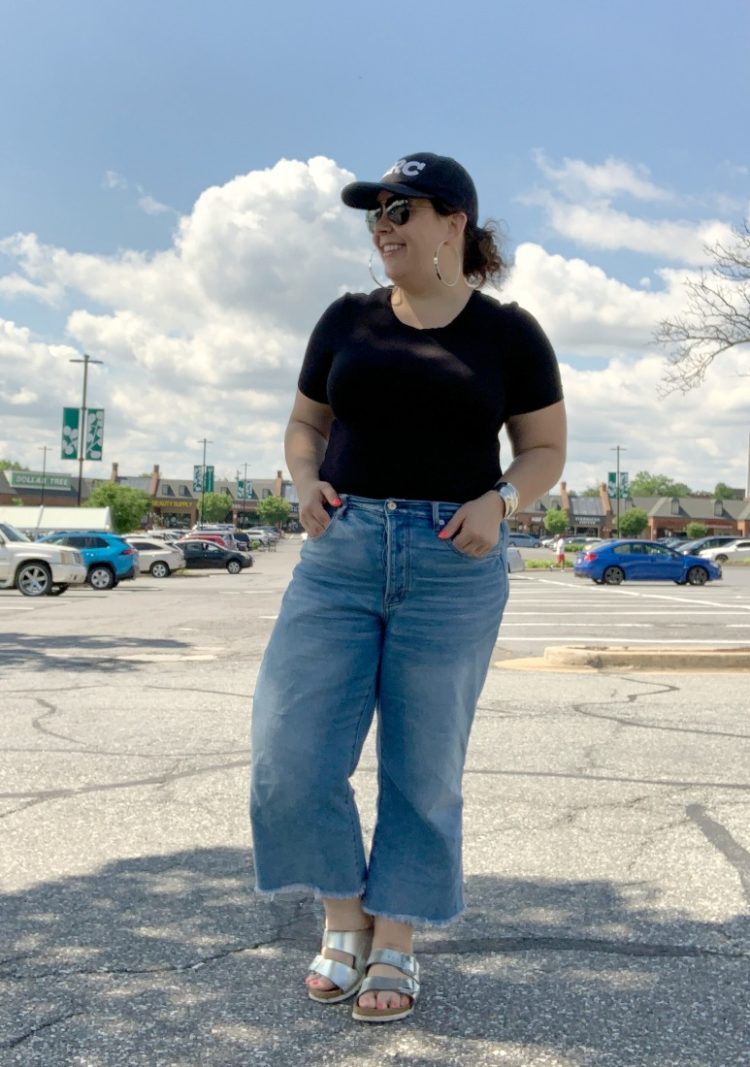 This look is titled, “Same jeans, different day.” This was an early morning when I had to hit the grocery store, ATM, PO box, and UPS drop-off before 9 am so it was a throw on clothes and hide the hair kind of look. I love these jeans for spring and summer because they're not too heavy but heavy enough to not get all saggy and baggy, and the wide cropped legs allow for airflow. Same silver Birkenstocks, but this time I styled it with the crew t-shirt from Universal Standard's Foundation collection (size XS). The Foundation collection is super stretchy and lightweight but as you see, quite opaque. Again the Jenny Bird hoops to make a relatively boring outfit look purposeful. My HRC cap to cover bedhead and my favorite black aviators.