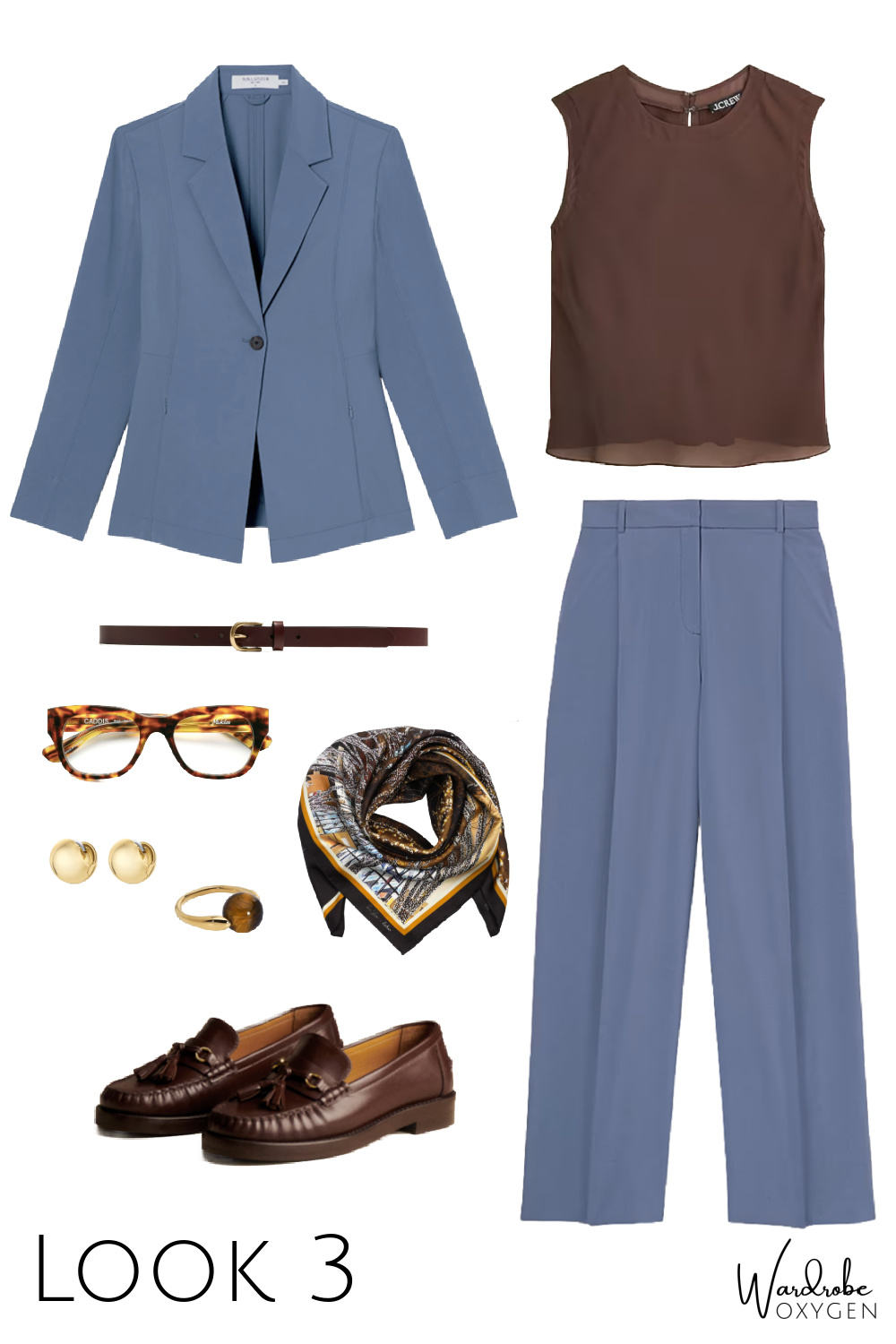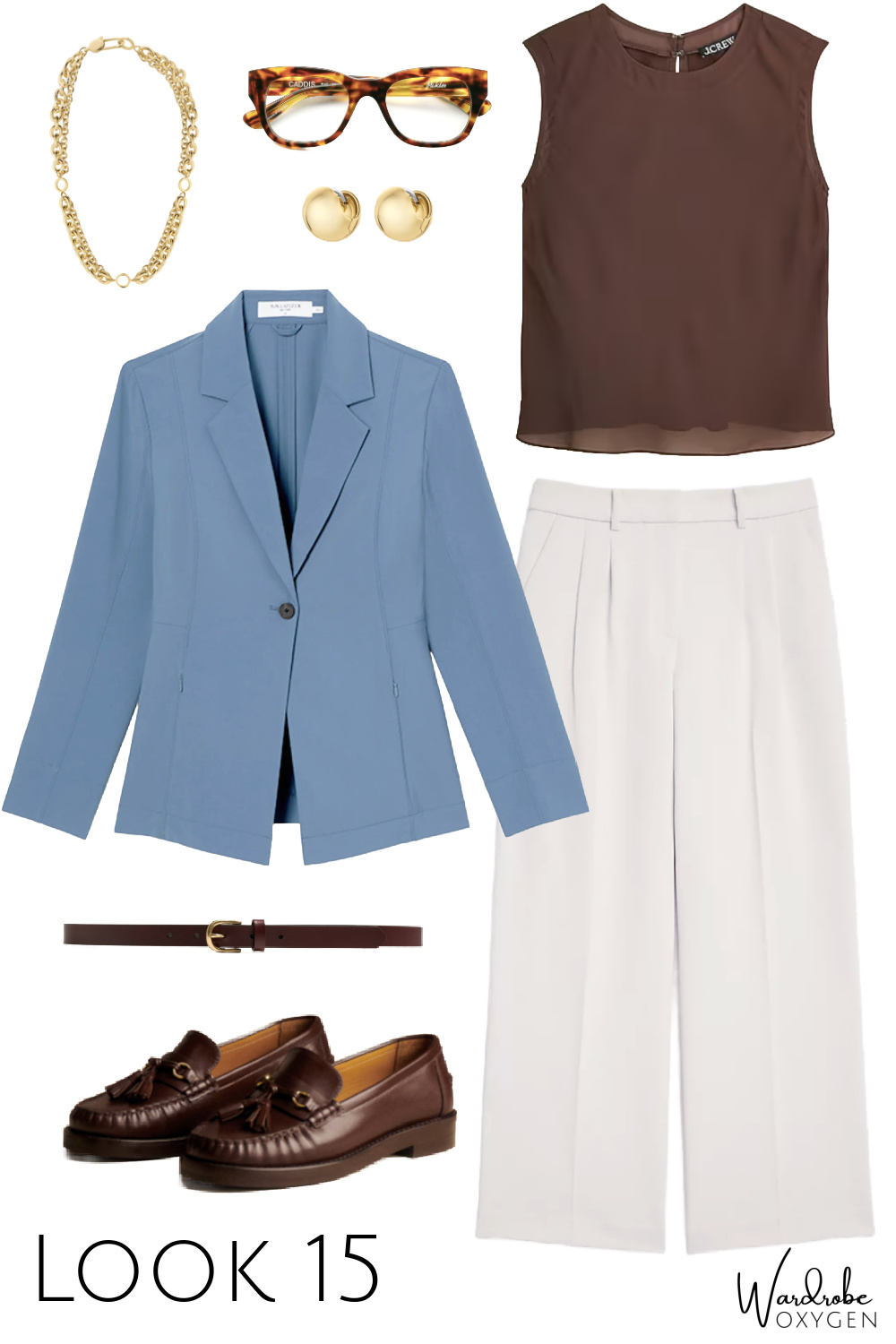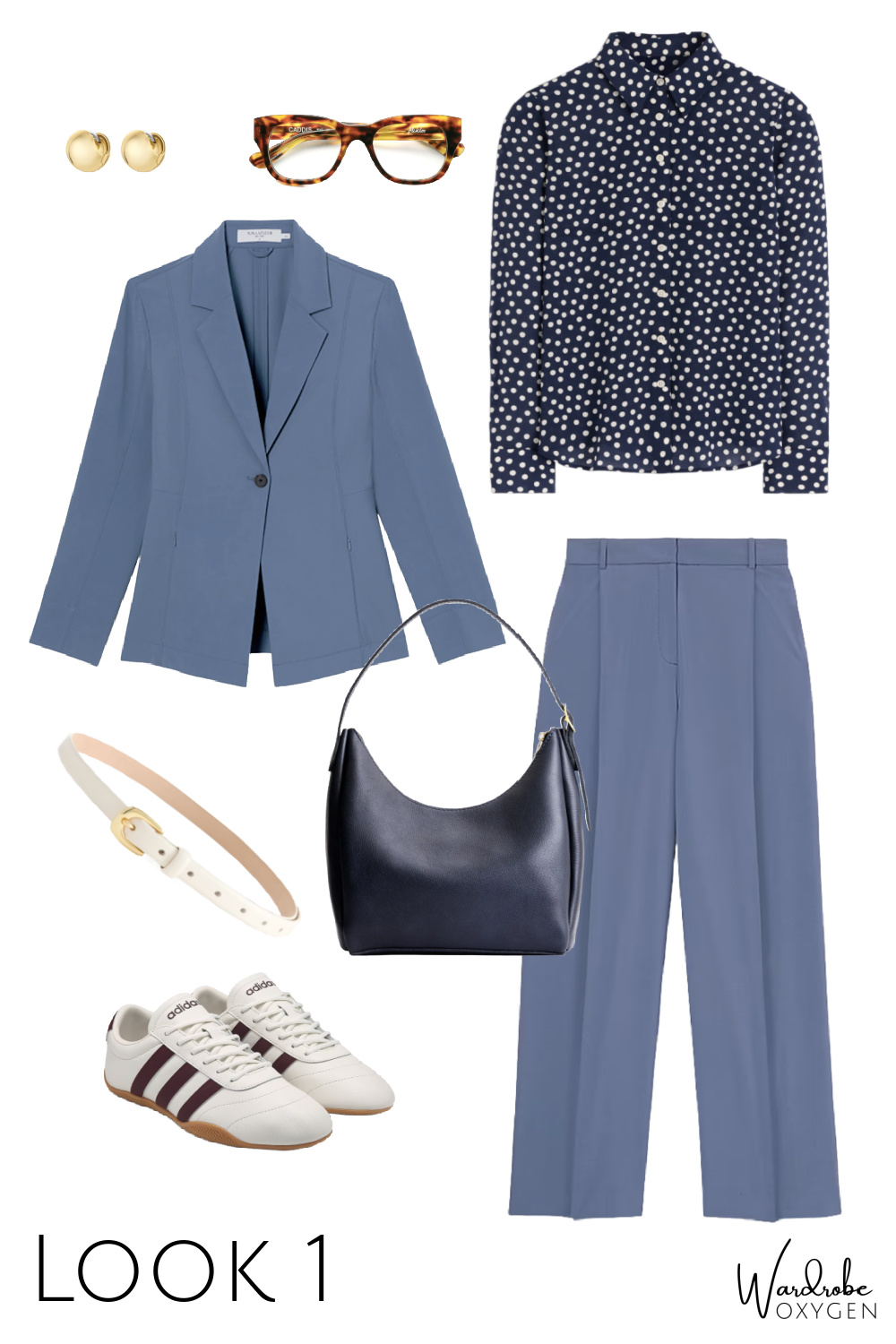 Shop the collage: blue jacket (00-20) | blue pants (00-20) | ivory jacket (XXS-XXL & petite) | ivory pants (00-18 & petite) | dotted blouse (0-20/22 & petite) | striped top (XS-3X & petite/tall) | sleeveless shell (XXS-3X) | crewneck sweater (XXS-3X) | belted sweater jacket (XS-XXL) | jeans (00-30 & petite/tall) | ivory belt | brown belt | statement earrings | small earrings | ring | necklace | bag | scarf | glasses | sneakers | loafers | not featured but in outfits below: lip color
