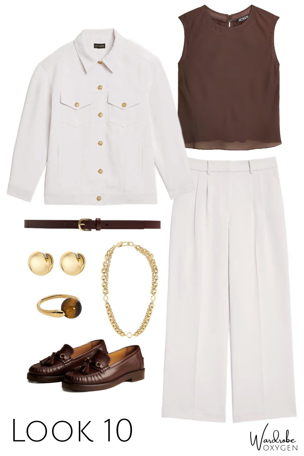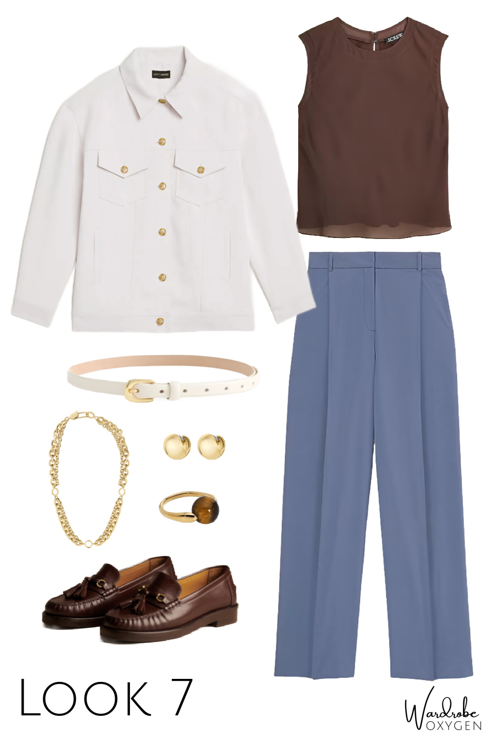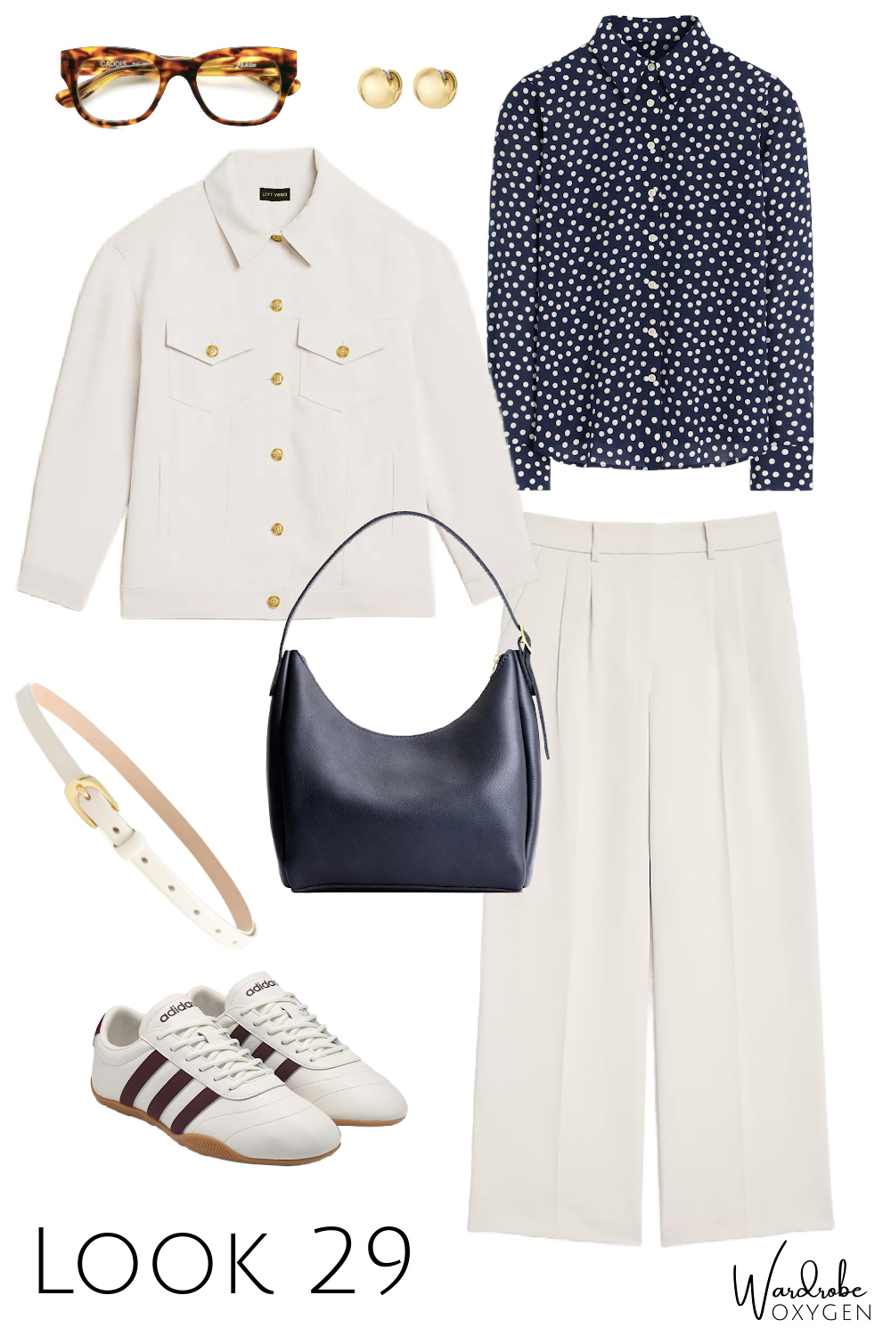 Shop the collage: blue jacket (00-20) | blue pants (00-20) | ivory jacket (XXS-XXL & petite) | ivory pants (00-18 & petite) | dotted blouse (0-20/22 & petite) | striped top (XS-3X & petite/tall) | sleeveless shell (XXS-3X) | crewneck sweater (XXS-3X) | belted sweater jacket (XS-XXL) | jeans (00-30 & petite/tall) | ivory belt | brown belt | statement earrings | small earrings | ring | necklace | bag | scarf | glasses | sneakers | loafers | not featured but in outfits below: lip color