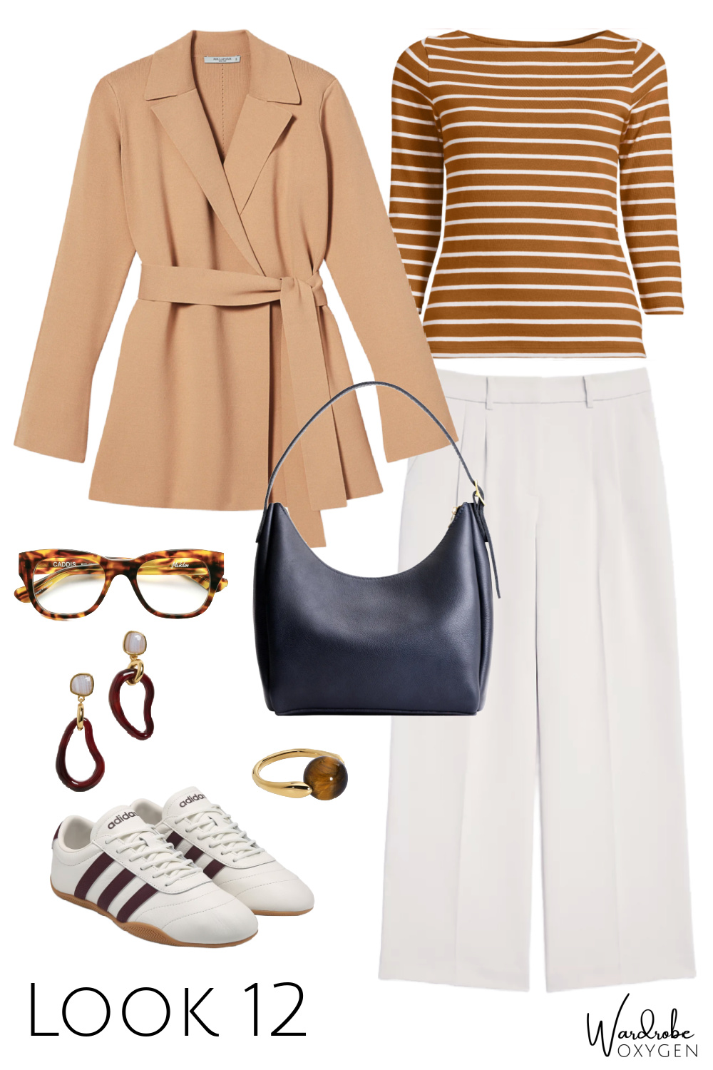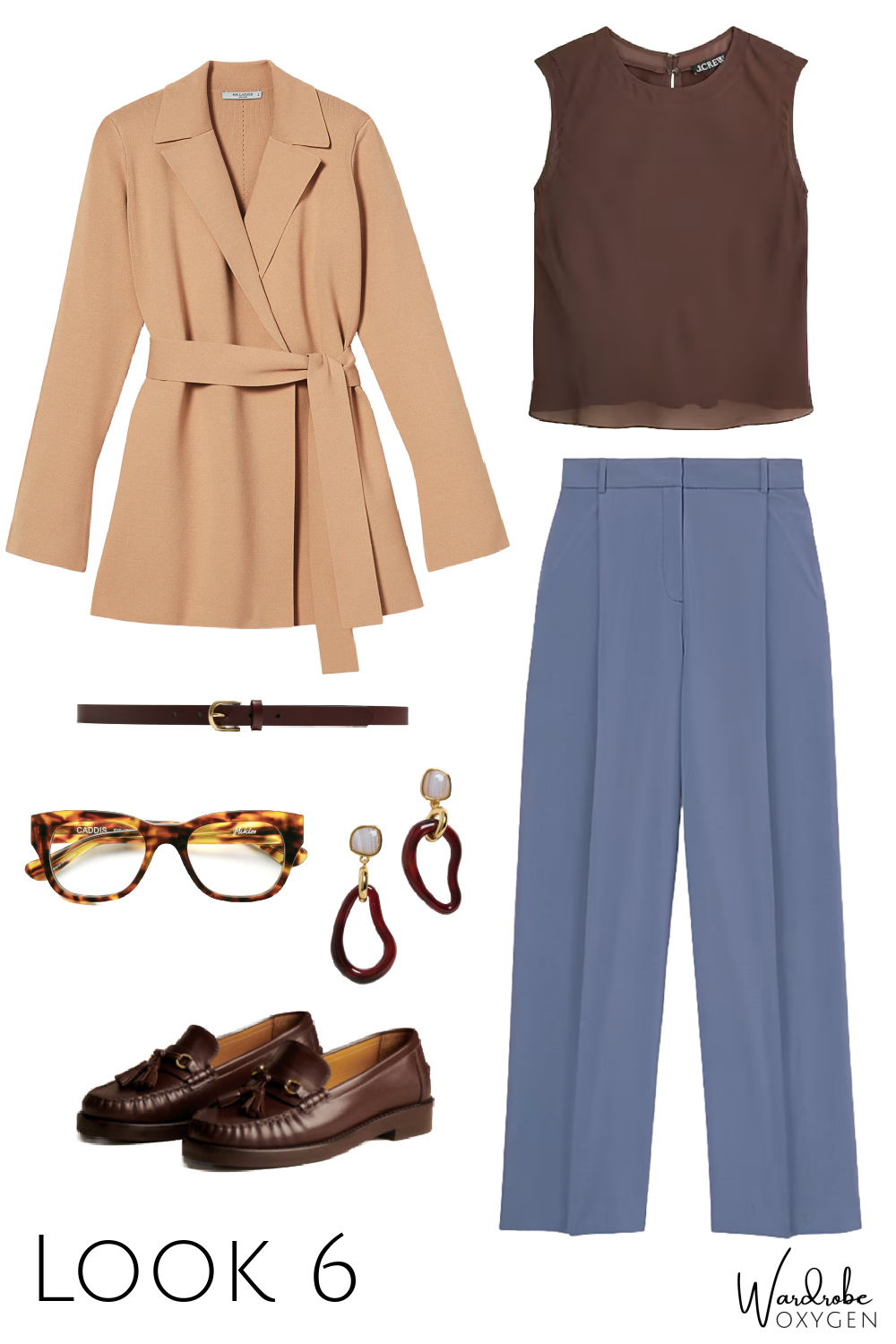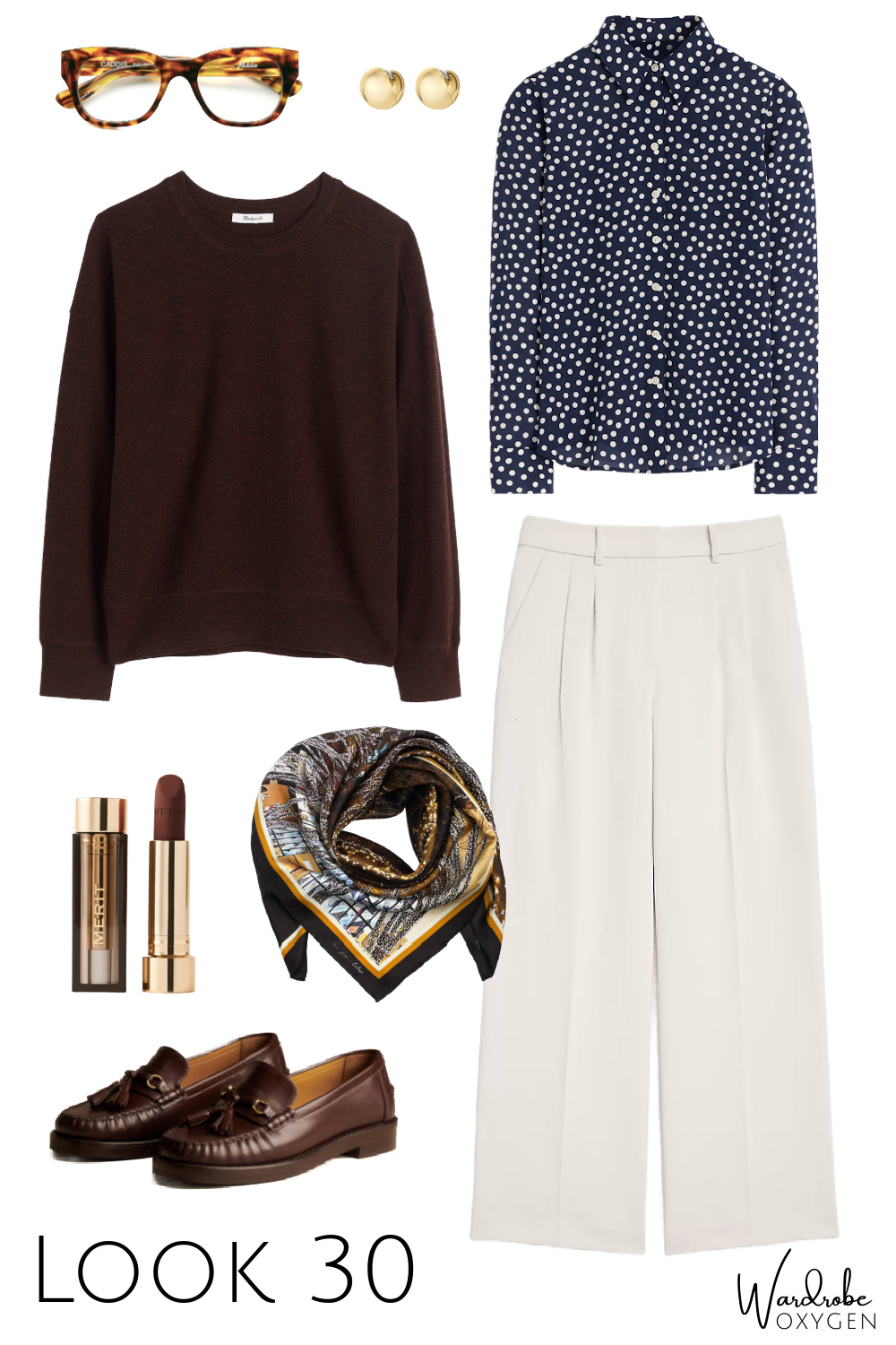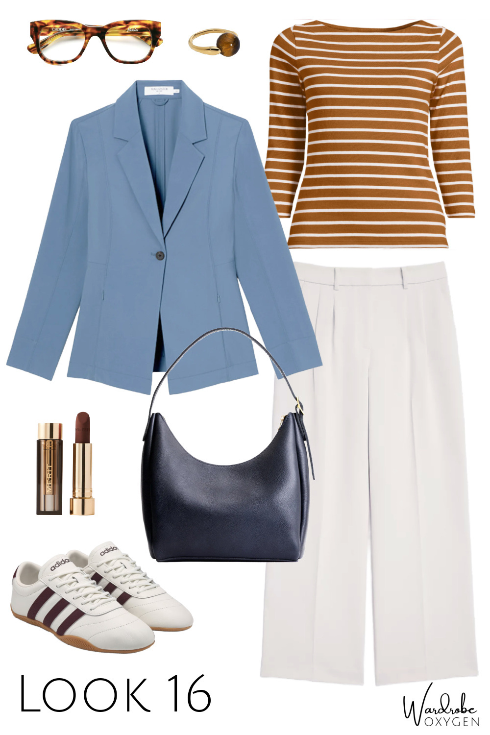 I made this capsule wardrobe with many items I personally own and can vouch for. The LOFT Versa jacket and pants? I own (see them on me here). The M.M.LaFleur blazer? I also own (see them on me here in a different color). I own the glasses in a different color, I own pieces from the scarf, bag, shoe, sneaker, and jewelry brands, own the bone-colored belt, the striped top in a different color, the silk blouse in a different print, the belted cardigan… I like to walk the talk and create truly functional capsule wardrobes you can feel confident in.