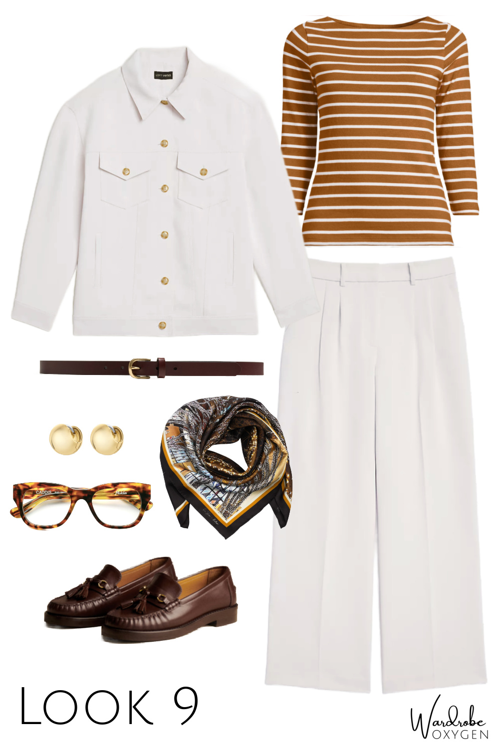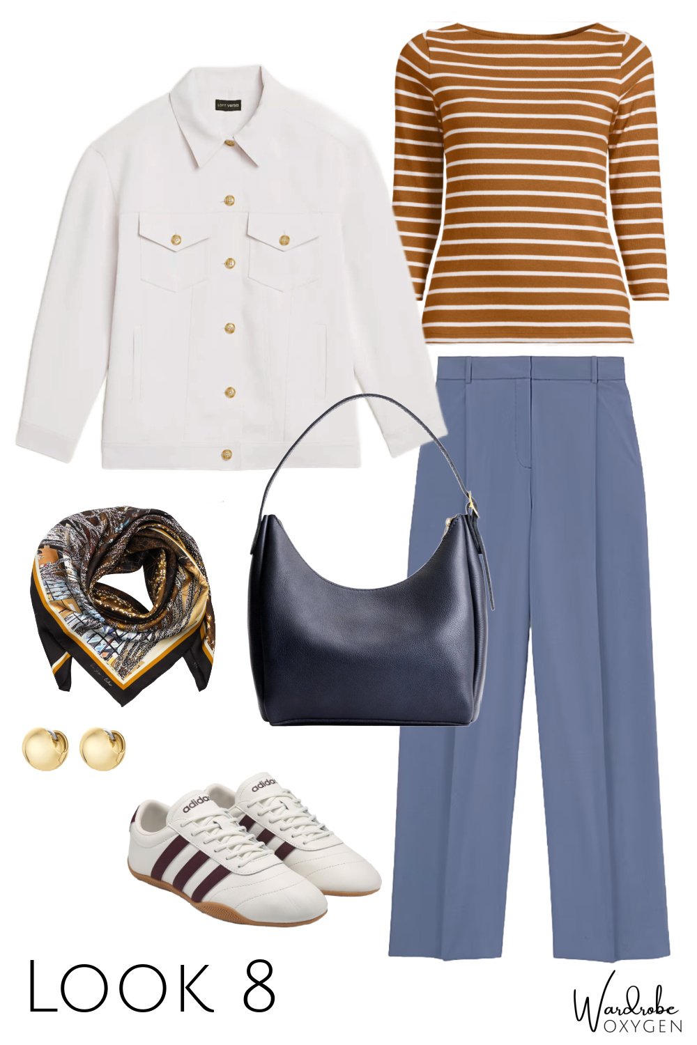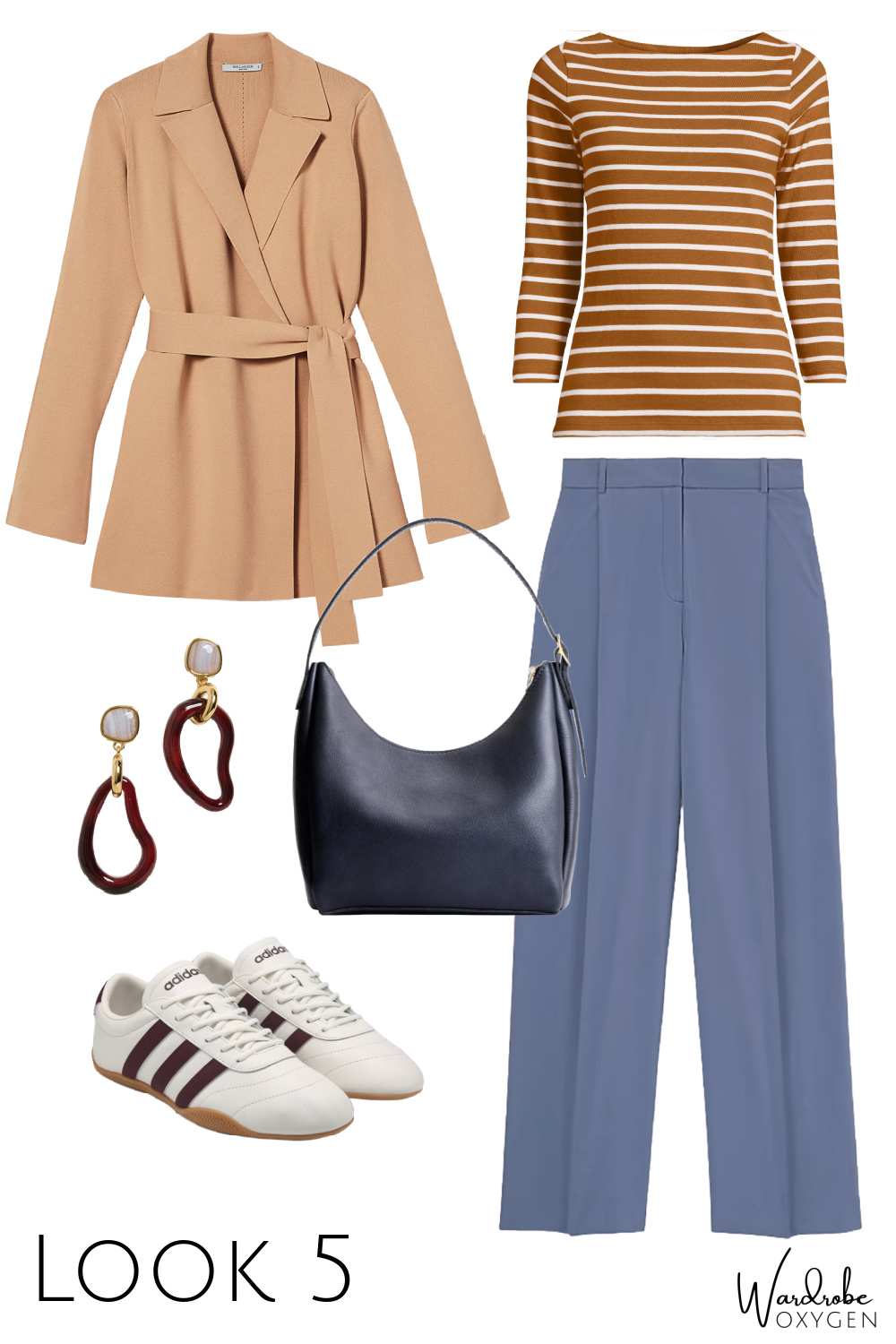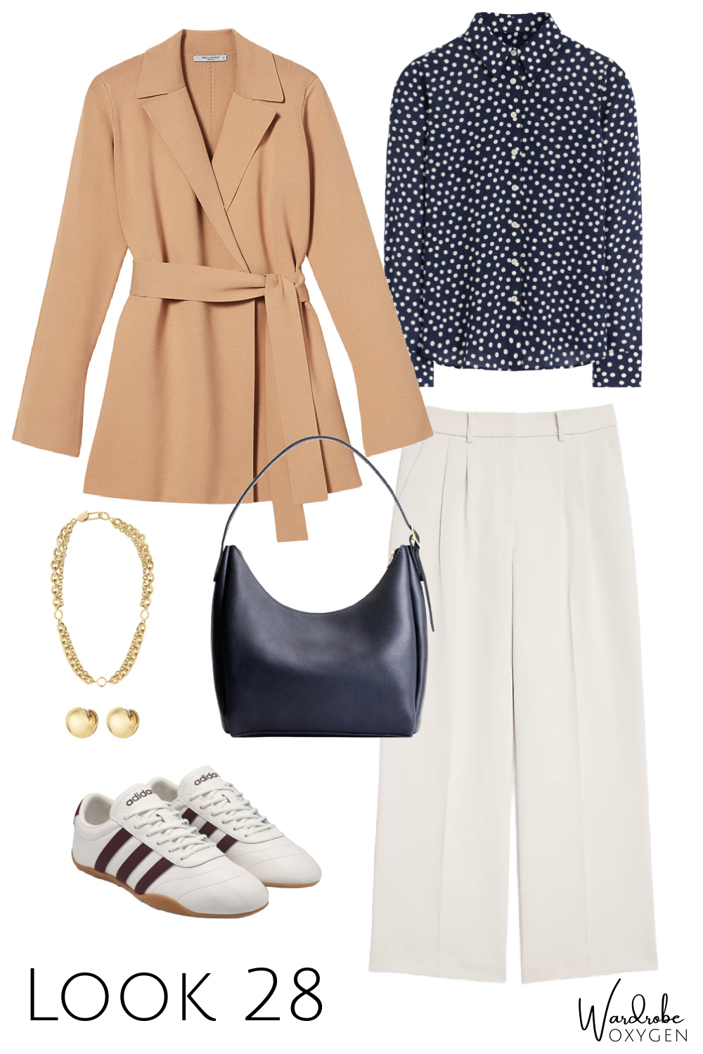 I made this capsule wardrobe with many items I personally own and can vouch for. The LOFT Versa jacket and pants? I own (see them on me here). The M.M.LaFleur blazer? I also own (see them on me here in a different color). I own the glasses in a different color, I own pieces from the scarf, bag, shoe, sneaker, and jewelry brands, own the bone-colored belt, the striped top in a different color, the silk blouse in a different print, the belted cardigan… I like to walk the talk and create truly functional capsule wardrobes you can feel confident in.